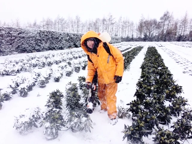 Even in the depths of winter the work doesn't stop on the nursery. Here is Keith wielding a blower to remove snow form the foliage of young rhododendrons. All the team were out in the snow either with blowers or soft brushes making sure no damage to our precious crop was done.